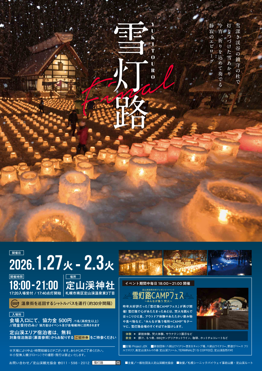 最初の開催から15回目の今期、札幌市の定山渓エリア、二見公園の改修に伴うリニューアルのため、現在の形式である“スノーキャンドルの雪灯路”は、2026年1月27日〜2月3日の開催をもって幕を閉じます。今回が「スノーキャンドルによる雪灯路」のラストを飾る特別な8日間となります。